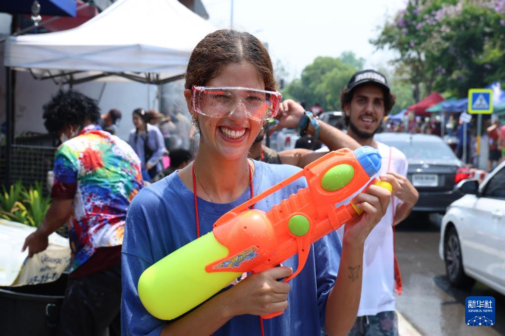 4月13日,人们在泰国清迈街头参加泼水节庆祝活动。新华社记者 孙玮彤 摄